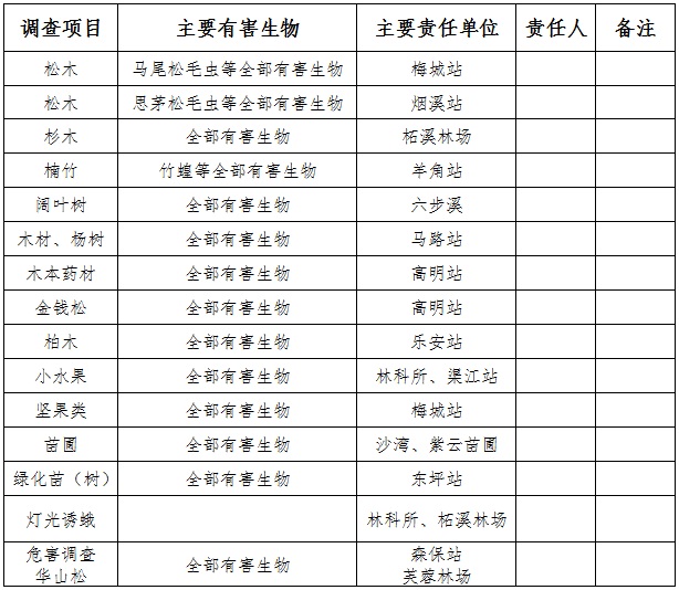 各责任单位要根据各自的调查项目合理安排人员和时间,确保本次调查任务的完成,各调查责任人要根据各自的任务,选择最适的调查地点和最恰当的调查时间尽可能地保证调查质量。没有明确调查任务的单位也要为本次调查添砖加瓦,在各自的辖区多留意,尽可能地将我县林业有害生物的种类、分布情况、危害状况调查清楚。